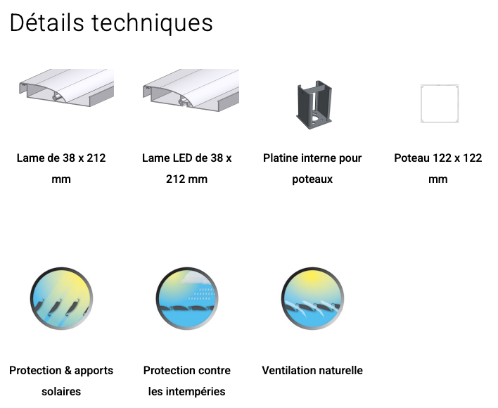 Éclairage LED blanc sur deux chéneaux de série, avec possibilité d’ajouter des LED dans les lames
